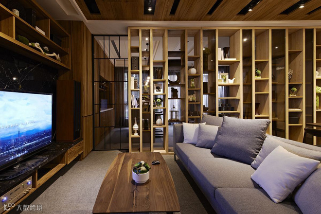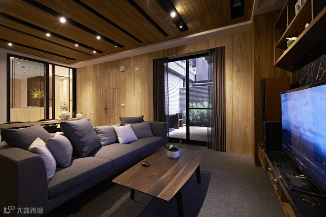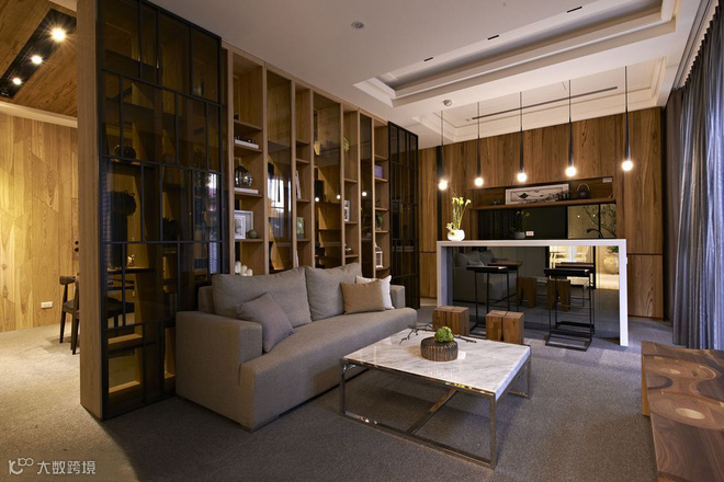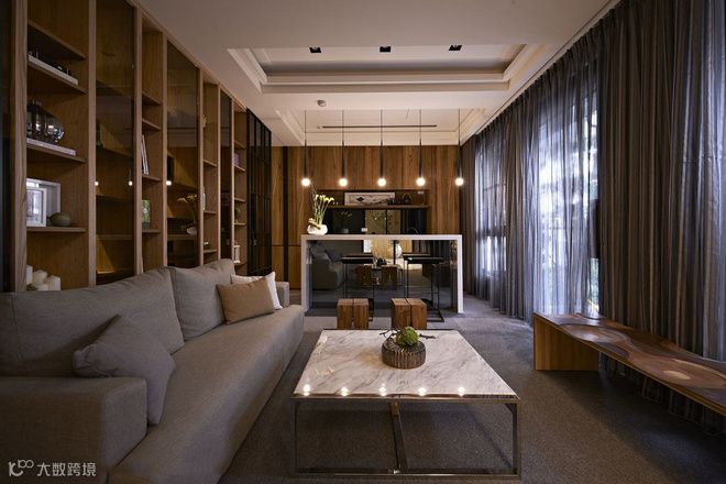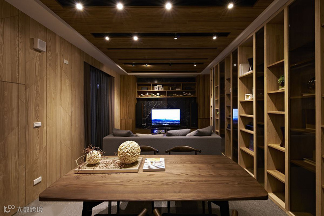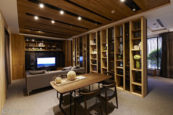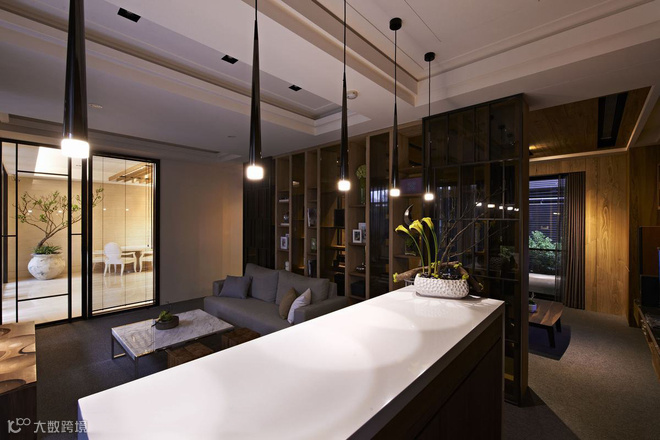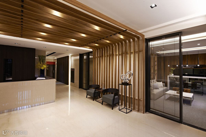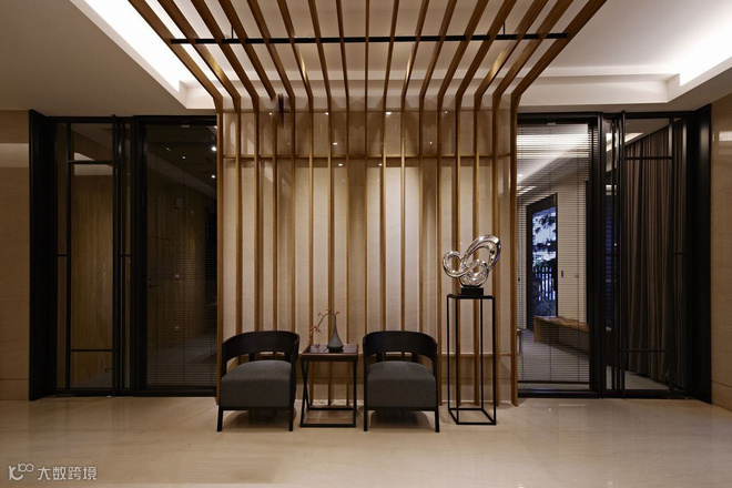 从立面延伸而上的木质格栅,拉升高度又消弭结构存在,定义主动线的设计亮点。左右分别通向交谊厅和视听室,内部以木质书架居中,划开半开放式公设空间,交错衬以通透玻璃介面,於光线与视觉的延伸对话中,两个休閒空间相映成景。