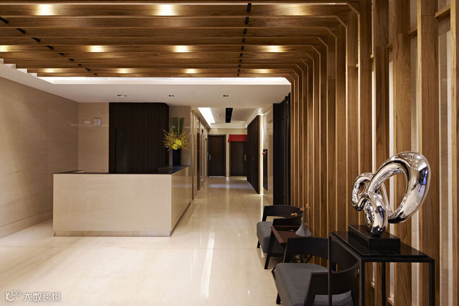 木质温润裡,释放居家生活的温暖,轻鬆自在的氛围蔓延於华厦大厅,在迎宾和建案的公设空间中,体现与日式建筑风格呼应的休閒调性。