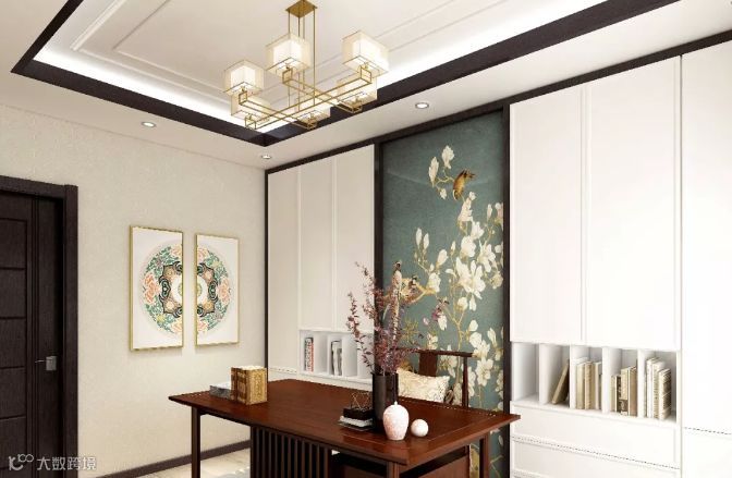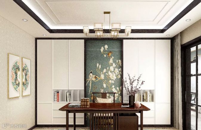这是一间意境悠远,禅静如水的书房。高大宽阔的封闭式书柜整洁干净,书柜与墙壁上精美的装饰物透露出清新淡雅的古典气息,现代艺术和古代情景融合的天衣无缝。古朴讲究的书桌极有分寸而又极其丰富的传达出内心世界的情感,超越空间与时间的边界,身处其中,让思维任意遨游。