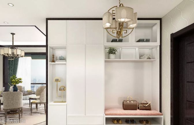 浅色的玄关柜中和了深色木门的厚重感,同时柜子的边框线条与整体空间及深色木门遥相呼应,包容随和,呈现出能进能退的和合之美。鞋柜的设计在满足实用价值的同时为这一方天地增加了更丰富的元素。镂空、繁复、造型别致的烛台和古意盎然的吊灯使玄关处的中式魅力立时显现。