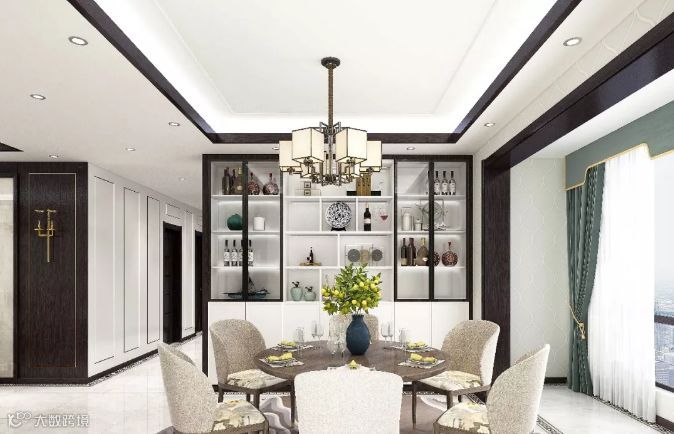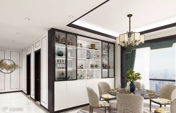 开放式餐厅呈现出平和内敛的用餐氛围,让吃饭也变成一件优雅的事。白色的酒柜更显得干净利落,宽大的落地窗则如同连接古典中式与现代都市之间的大门,身处其中,如梦似幻。