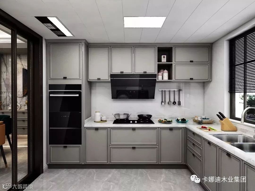 掩门柜+吊柜+开放格的组合,不仅能满足大容量储物需求,还提供了不同的收纳选择。油烟机、烤箱等家电都巧妙地嵌入橱柜,简洁美观,节省空间。