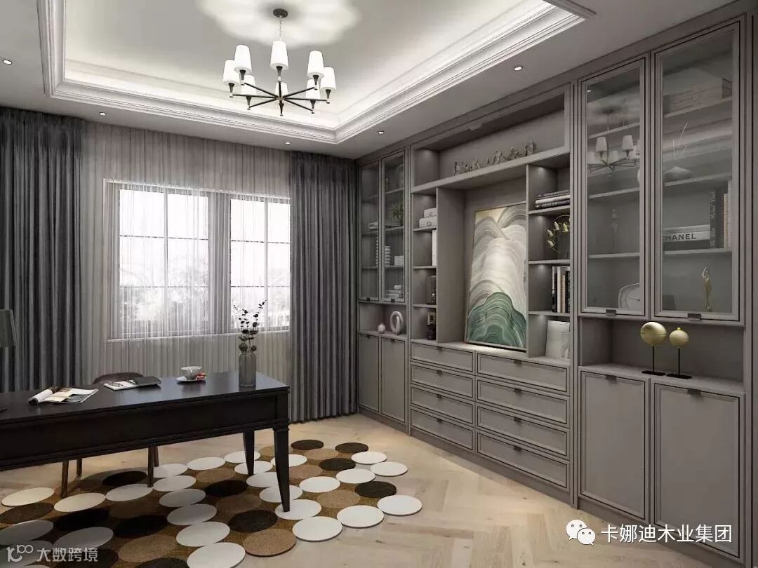 高级灰落地柜摆上抽象的挂画,恰到好处地彰显了现代质感,浪漫写意的气息流淌一室。书柜中部镂空,配合玻璃门和开放层板设计,缓冲整面墙柜的沉重,工作阅读,思维得以无限发散。
