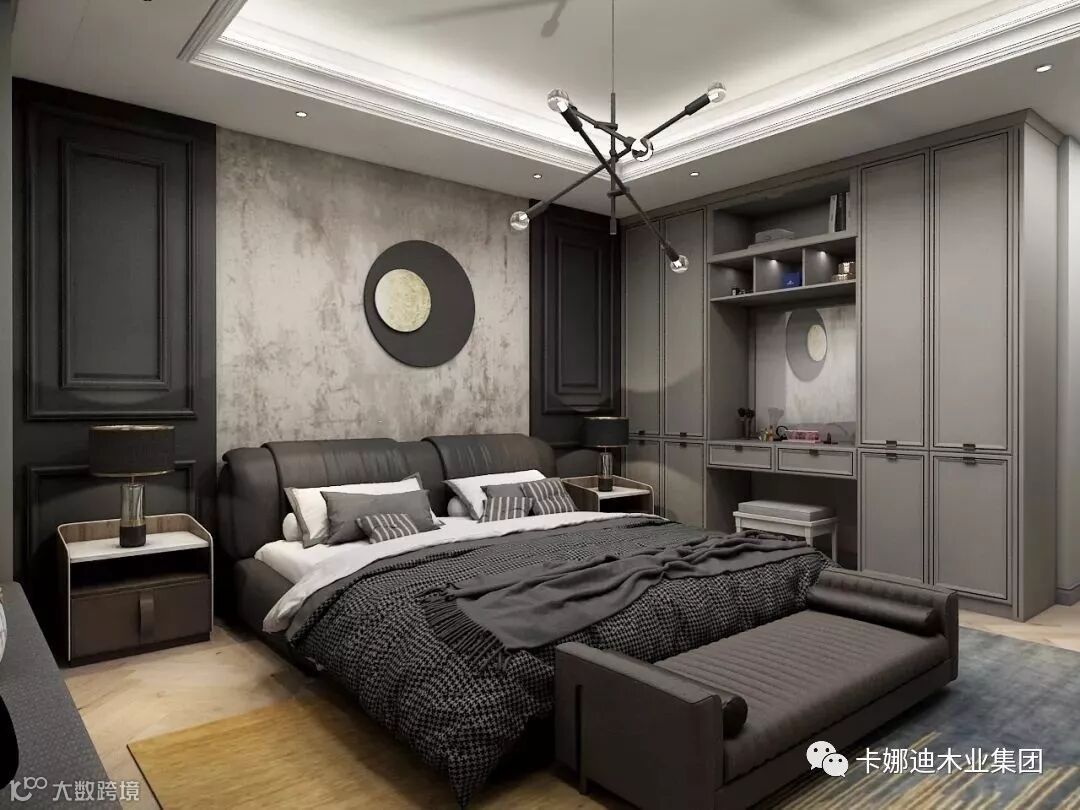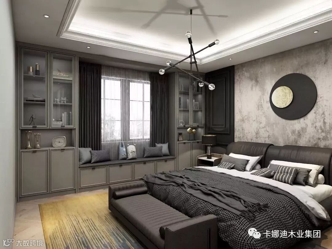 主卧配色臻选深灰、姜黄、睿智黑,比例深浅有致,高级感渗透到每个角落。