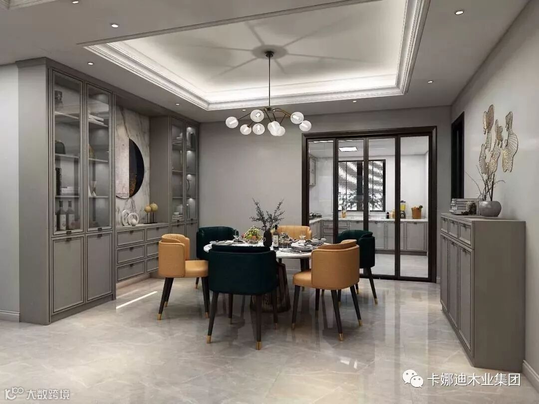 餐边柜加入玻璃门和矮柜的设计,柜内摆放红酒、别致餐具,台面放置工艺品、花束,每一顿都是“美”的享受。