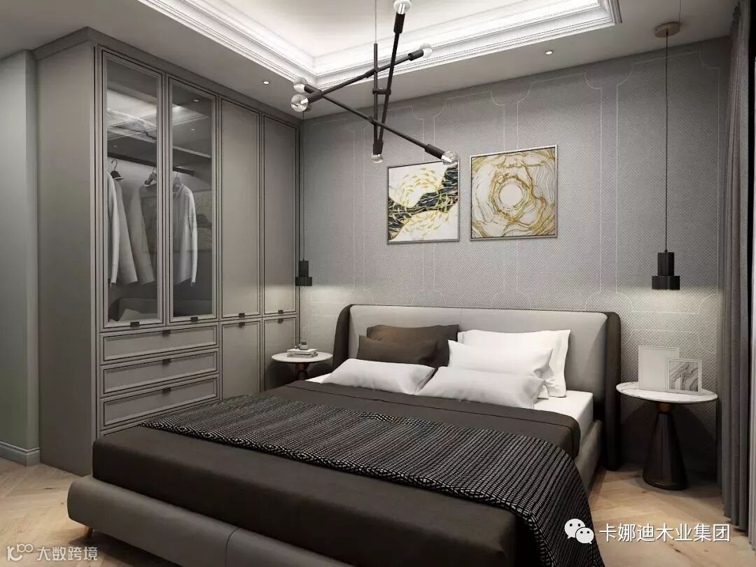 次卧衣柜虽小,五脏俱全,悬挂区、叠放区、存储区,功能明确,分区合理。金属挂画、布艺背景墙、玻璃门板在光线下交汇,不同材质融成艺术的语言在空间里徜徉。