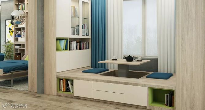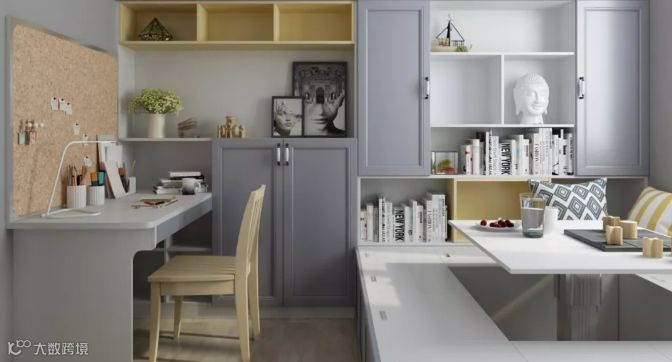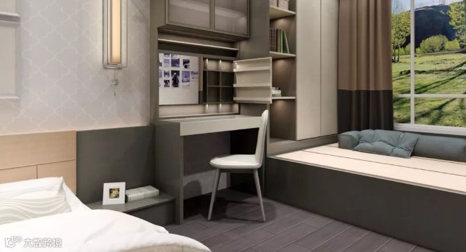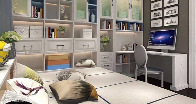 书柜、写字台、收纳柜,一个也不能少,书柜通透,空间使用率极高。不同的层板和柜体有不同的功能让房间小而有序。大小收纳空间按功能规划错落有致,抽屉、层板相辅相成,充满设计美感。