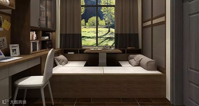 借用房间中原有的飘窗设计,将其打造成为榻榻米,让卧房多了一个阅读的区域。书柜的部分以开放式和封闭式相结合,满足多种储物需求。