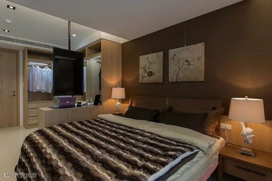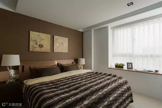 穿透窗纱的日光洒落咖啡色系的床头墙与寝饰,交融沉稳静定的卧眠氛围。