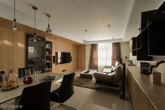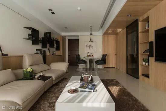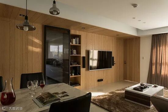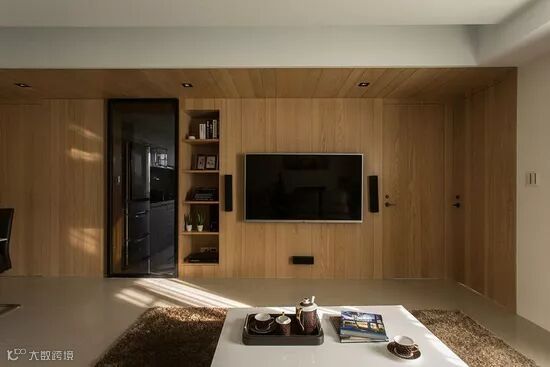 设计师利用厨房过大的过道动线,另构独立备餐台机能,并将电视机柜内嵌其中,保有电视墙面的干净清朗。