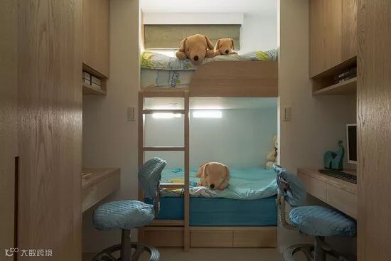 上下铺规划与独立书桌的设计,让年幼的两个小男孩可彼此陪伴,且各拥独立的小天地。