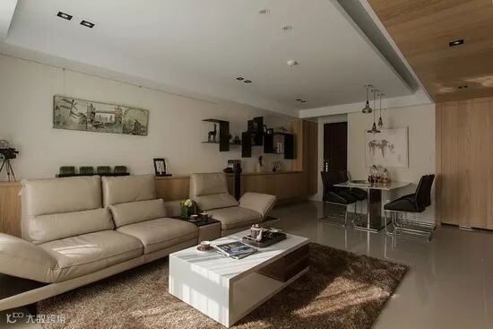 从玄关延伸入内的木皮线条蕴藏大容量鞋柜机能,结合沙发后方的上掀柜设计,形塑干净齐整的简约概念。