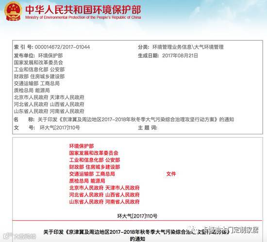 2017年8月,环保部门联合六省事印发《京津冀及周边地区2017-2018年秋冬季大气污染综合治理攻坚行动巡查方案》。实施包括燃煤、工业、机动车、扬尘、重污染天气应对等方面工11大项、32小项更严格的措施,不符合环保标准的建材企业面临停产,水泥、砖瓦窑、陶瓷、石膏板等行业全部停产、钢铁、铝等全面限产,装修材料来源吃紧。