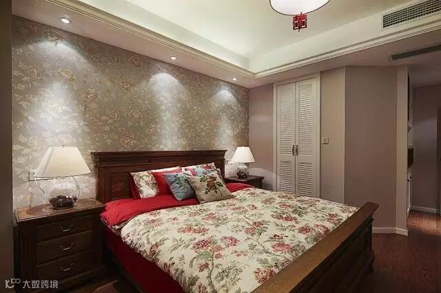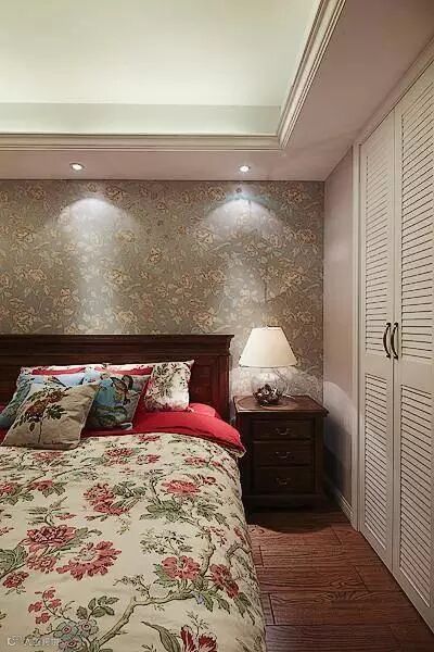 主卧,背景墙和床品的繁华样式让整个美式的大气风格更添温馨。