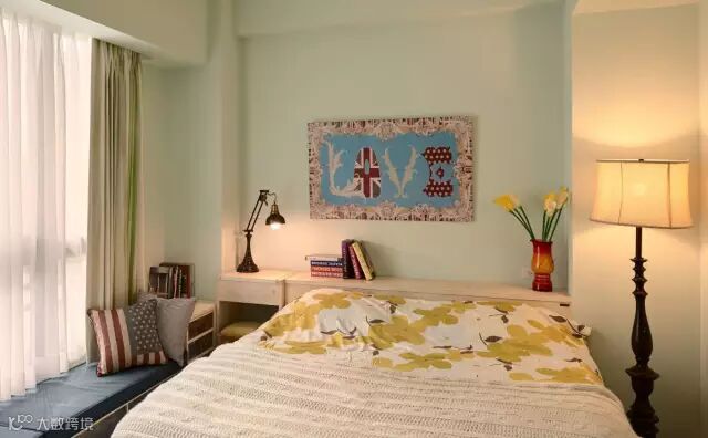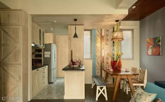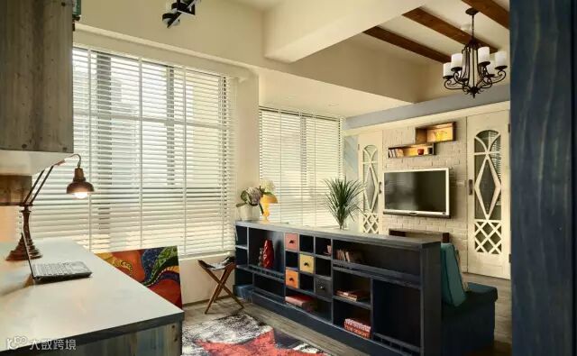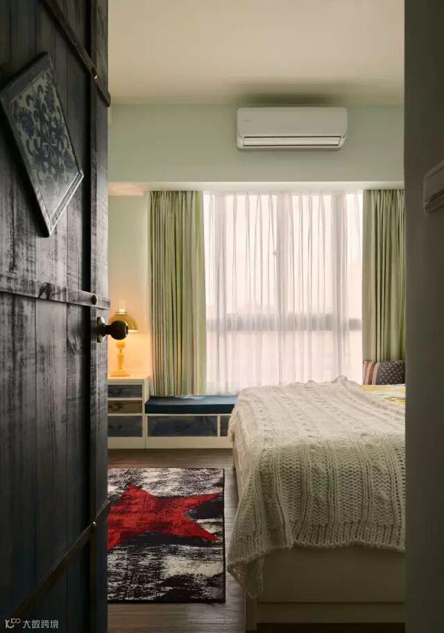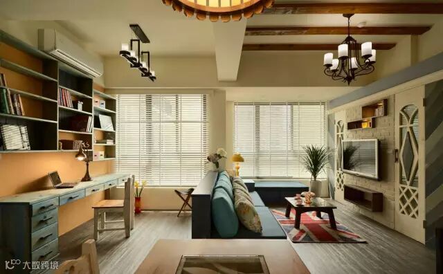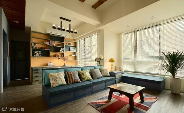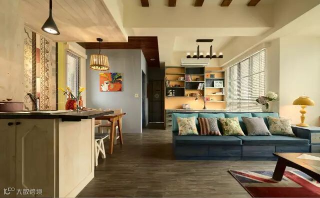 快节奏、繁华的城市当中,总希望有安静的栖息之地,感受到安逸舒适自由的生活,深色地板结合彩色家居搭配结合,空间区域对比划分明确,使空间充满世外桃源之感,水蓝色的美式沙发拉高客厅清爽度,搭配国旗图样的地毡与碎花抱枕,增添度假风格