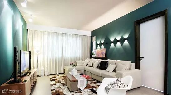 客厅的沙发是灰白色的布艺沙发,和电视墙顶部的射灯不一样的是,沙发墙的LED射灯置于墙的中间,两边的灯光透出来倒影在纯色的沙发墙墙面上,巧妙地形成了一种菱形的格纹,一举两得,很有创意。此外,茶几下方的拼色毯也是一个很大的亮点,很有品位的选择。