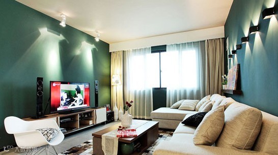 先来看看客厅,客厅的两面墙全部刷成了绿色,搭配客厅浅色的软装,使得整个客厅元素很丰富不空洞。电视墙并没有多加装饰,电视机和两旁的音响用简单的地柜式电视柜撑起来,很简约地装饰了一下。低矮的家具立显北欧风格的特色。
