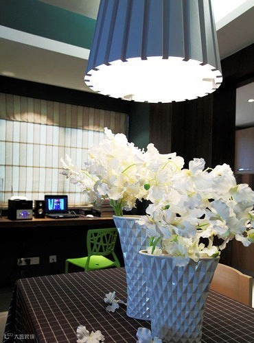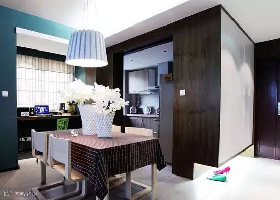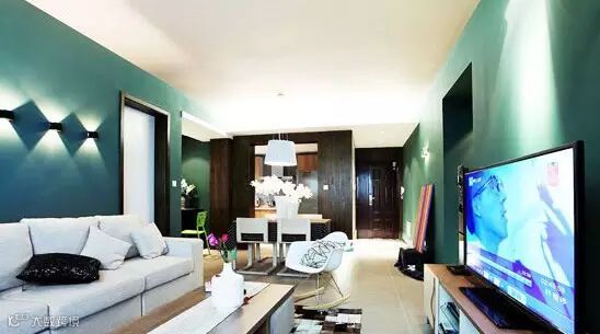 客厅看餐厅的角度,厅的主题基本上是绿色搭配白色和咖啡色,色彩处理得十分精准。沙发旁的门是通往次卧的,四周做了一个黑框,十分有立体感,简直就是点睛之笔。