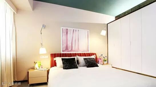 结构很简单的主卧,只有一张双人床,但是颜色搭配得很是欢喜,很简约大气又舒适的感觉。