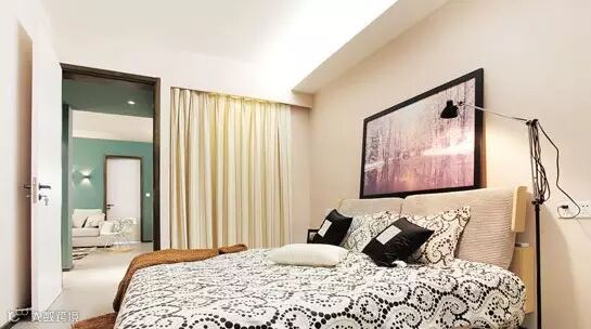 主卧的另一个角度,因为还没有放床头柜,床头代替台灯放了一个落地灯,很有范。卧室对门是次卧。