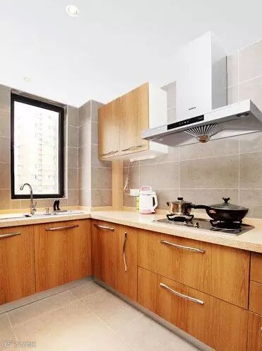 厨房采用原木色的实木橱柜,展现出完美的清洁干净。