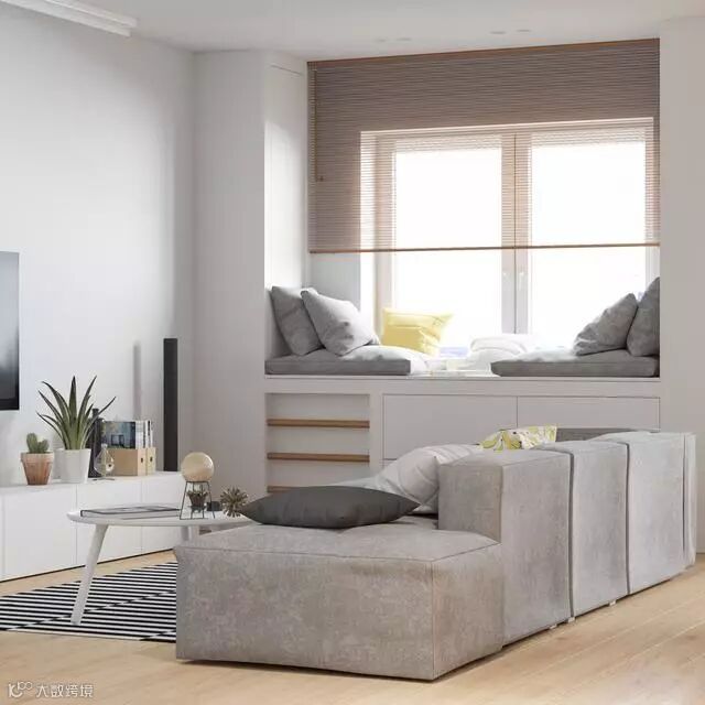 飘窗的设计缓解了客厅的储物压力,铺上软垫后让这里变得更舒适温暖了。