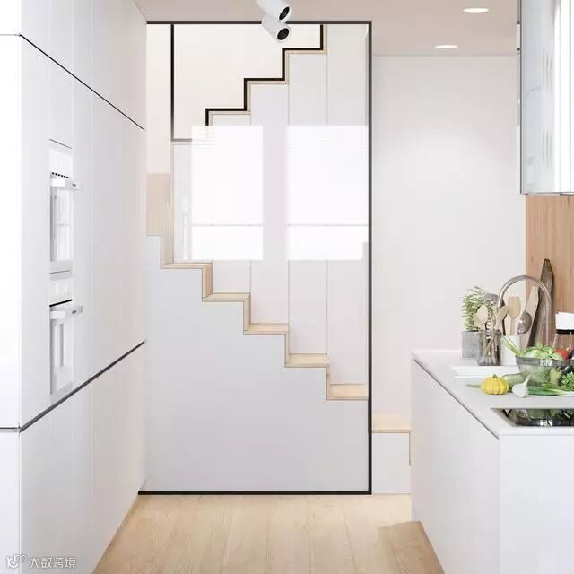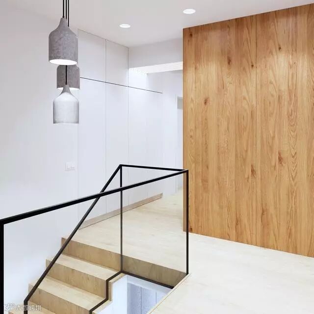 这样简单却并不粗暴的楼梯扶手设计,条纹清晰的原木柜和白墙被衬托出一种别样的时尚。