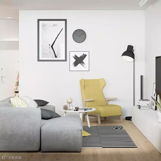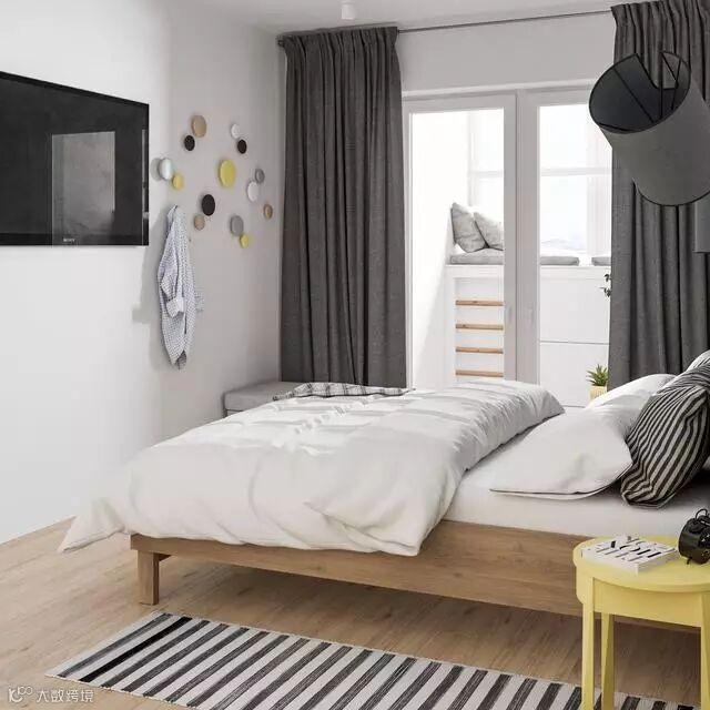 柠檬色的床头两张小圆桌,搭配浅黄色的陈列柜,黑白灰的房间再也没有单调冷酷的气质啦。