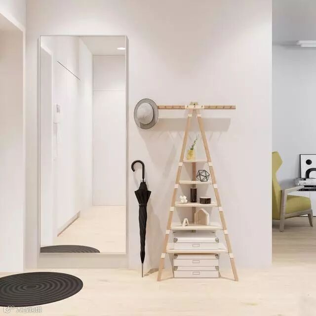 玄关这儿的三角陈列架很简单,简单的自己动手也可以做一个出来,三角架的顶端还特意横搭一根木棍,挂伞放帽子什么的最方便了。还有被这放在门口的全身镜......旁的门毯打败啦,看着是不是像蚊香啊,哈哈,黑色不错,百搭又耐脏,新技能get。