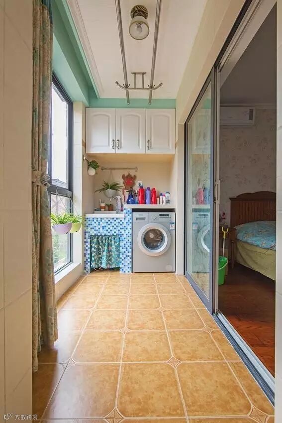 ▲卧室旁的阳台上有洗手池、洗衣机、储物柜和晾衣杆,在这里洗漱、洗衣和晾晒都很方便。