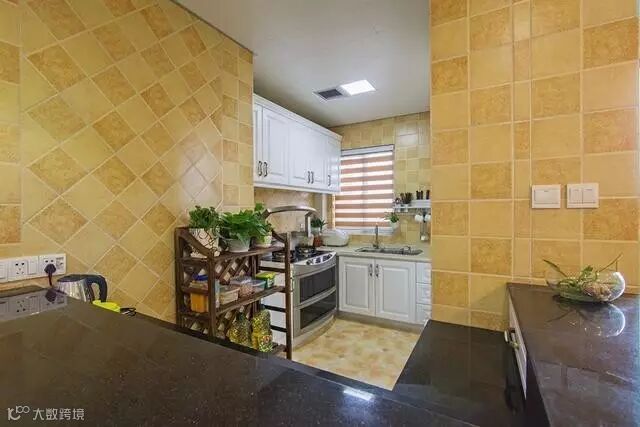 ▲厨房的墙面和地面铺上土黄色瓷砖,加上白色橱柜,和整个屋子的格调一致。