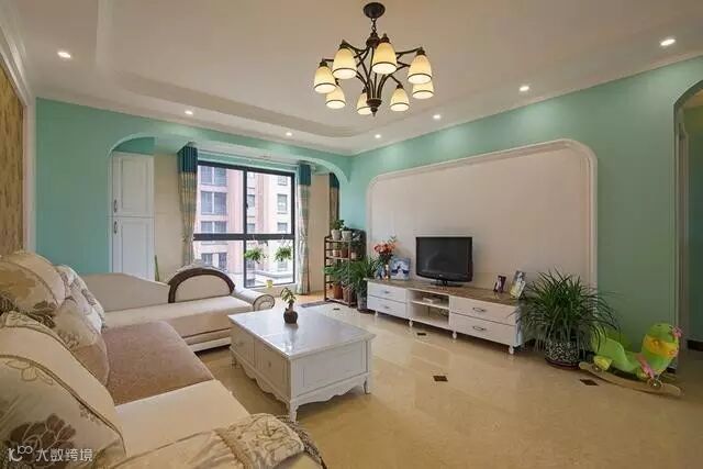 ▲水蓝色墙面、大大小小的盆栽给客厅带来大自然的清新之气。