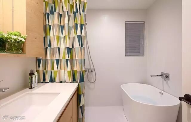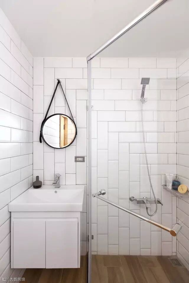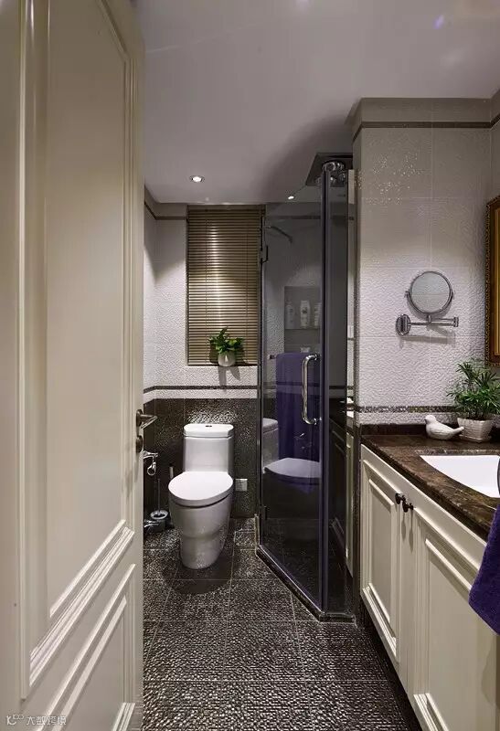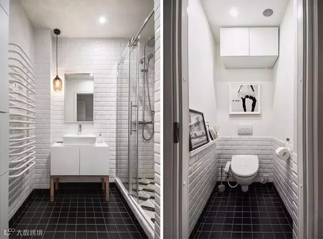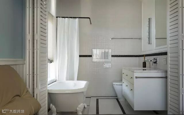 ▲ 在白色中点缀黑色的腰线,地面用黑色制作波打线,值得一提的是放置浴缸的位置比其他做低了一小截高度,就算有水溅出来还是会流到浴缸下面的地漏排水处