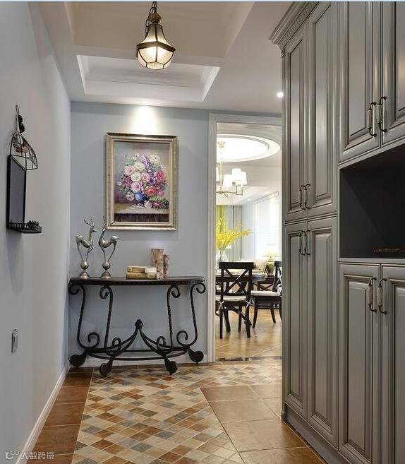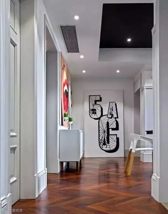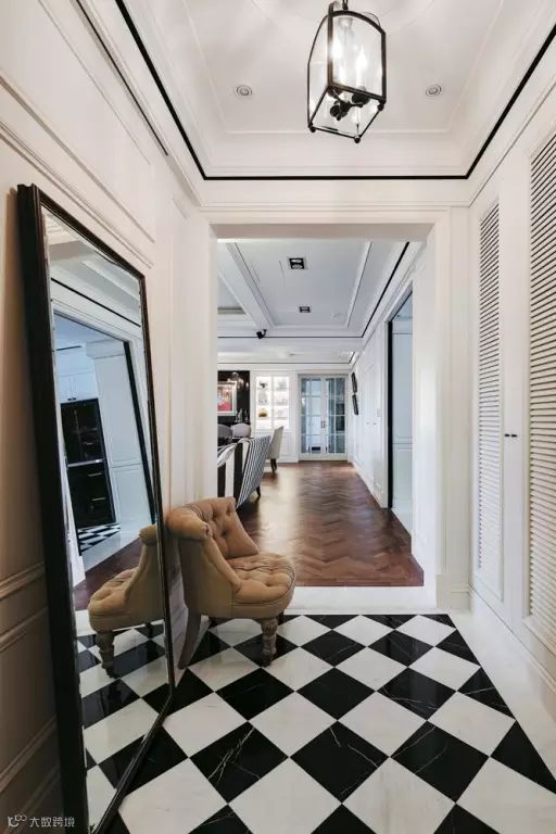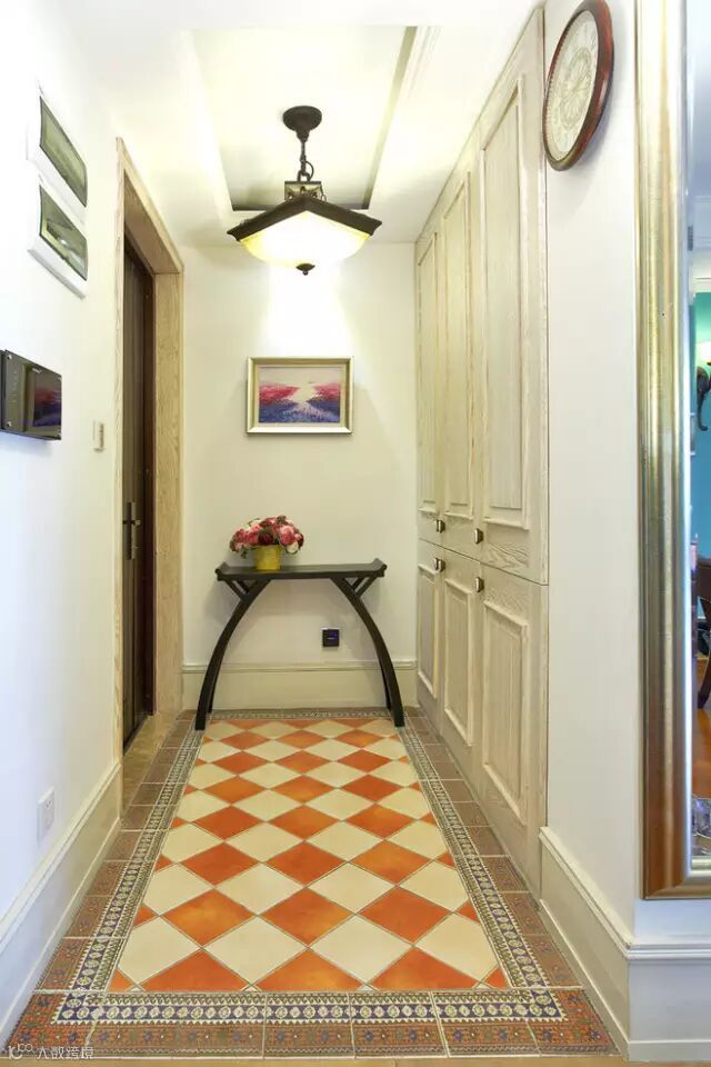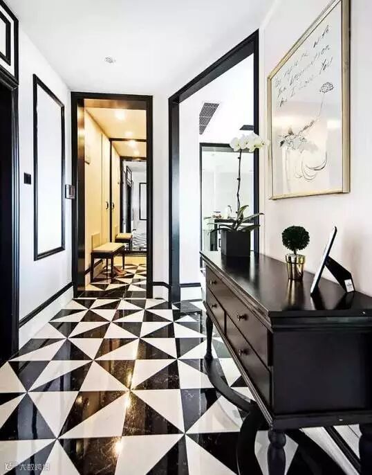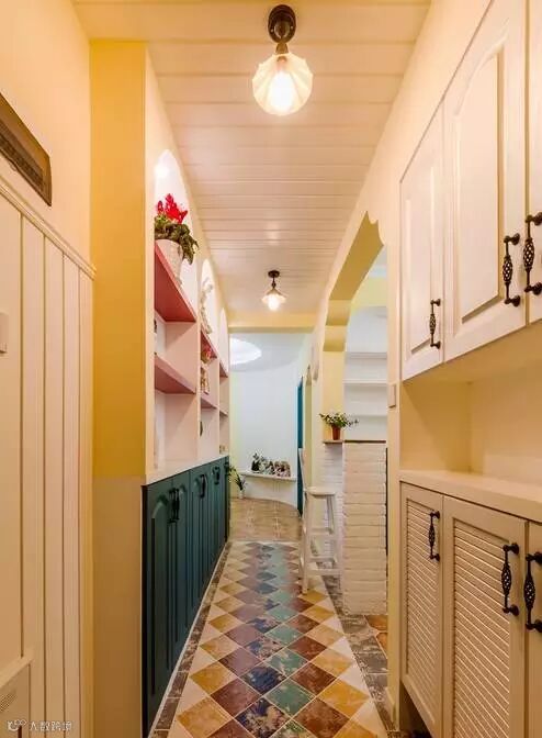 过道的面积有限,导致可发挥的空间不是很大,有些设计就会把视线重点放在地面上,毕竟地面是相对来说最完整的一块区域。
