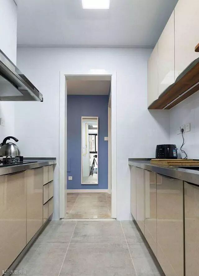 进门就是厨房,由于通往生活阳台就做成了双线性的,水槽和灶台分开在两边。