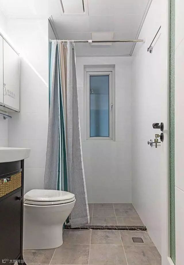 最后就是卫生间,干湿分离,用浴帘隔断。洗手台的周边就利用起来做柜子收纳了。