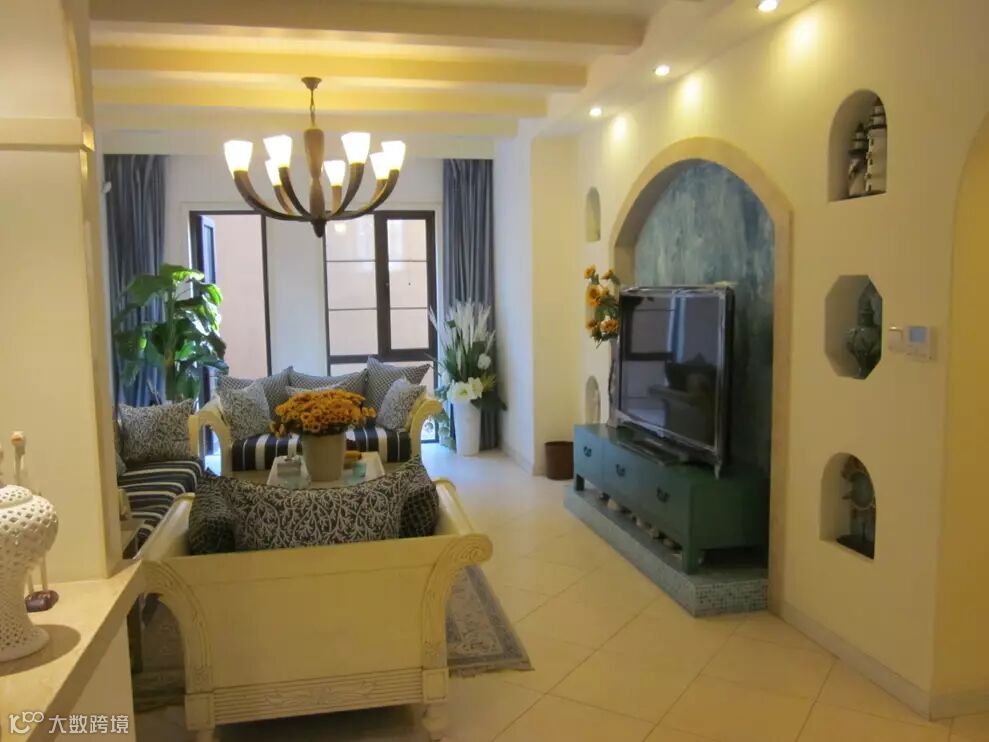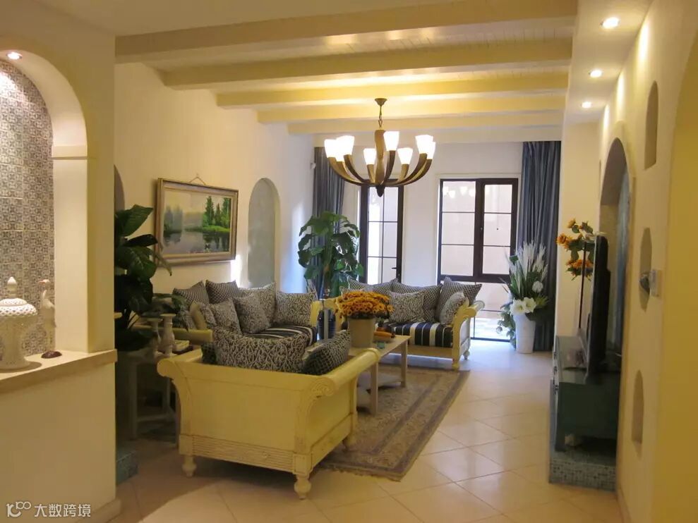 ▼客厅,整体给人一种比较奢华上档次的感觉,天花直接做成假梁的造型,墙面则挖成拱形形状,搭配一款田园风格的蓝色调坐垫沙发,在配一些粗大绿植的衬托下,尤其上档次;