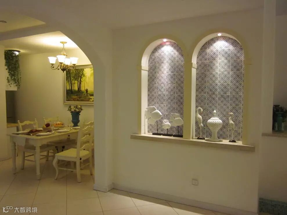 ▼客厅与餐厅直接的过道,墙面同样挖成拱形的造型,再做成一个台面用于摆放装饰品,灯光的照射下显得很精致;