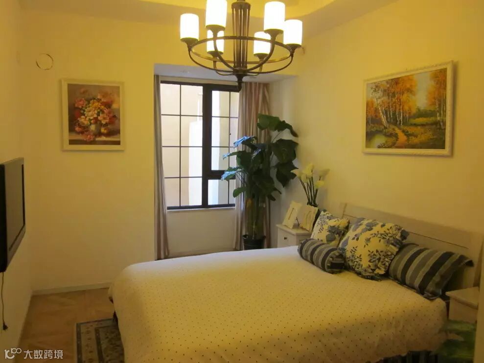 ▼卧室,米黄色的墙面,搭配一组彩绘装饰画,然后选购的是波点床单,很喜欢这款床单,给人很舒服的感觉;