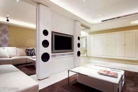 视听空间是客厅视觉注目的焦点,现代住宅愈来愈重视视听区域的设计。通常,视听区布置在主坐的迎立面或迎立面的斜角范围内,以便视听区域构成客厅空间的主要目视中心,并烘托出宾主和谐、融洽的气氛。