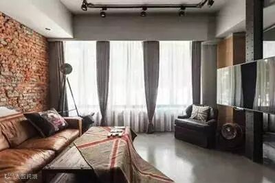 做旧的沙发软包和铁艺复古花架都个性十足。尤为吸人眼球的是砖墙和水泥墙拼成的背景墙。这款背景墙制作时并没有太复杂,因为选择了逼真的壁纸装饰墙面,环保方便。