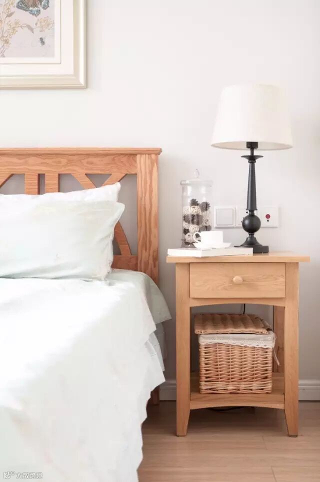 木质的床头柜,仿佛闻得到天然的木香,没有复杂的花纹和曲线,简单的设计更加经久耐看。