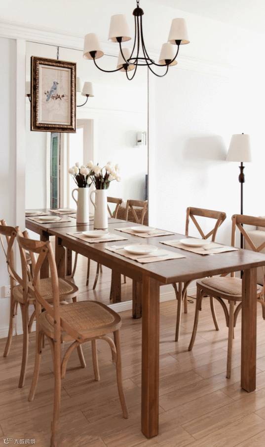 从这张原木装修风格效果图中大家可以看到,空间都被充分利用起来,客厅和餐厅被放置在同一个空间里,用镜子拓宽视觉,餐桌用来工作或是娱乐真是再好不过了。