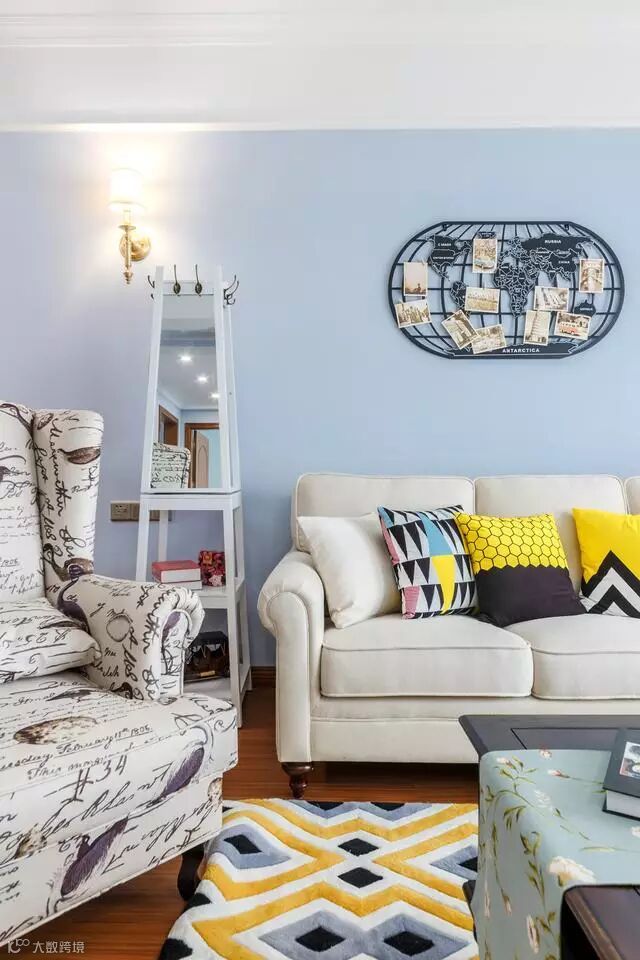 米白的布艺沙发十分舒适,背景墙上是一个装饰地球,上面贴着屋主去游玩的照片,满满的回忆。