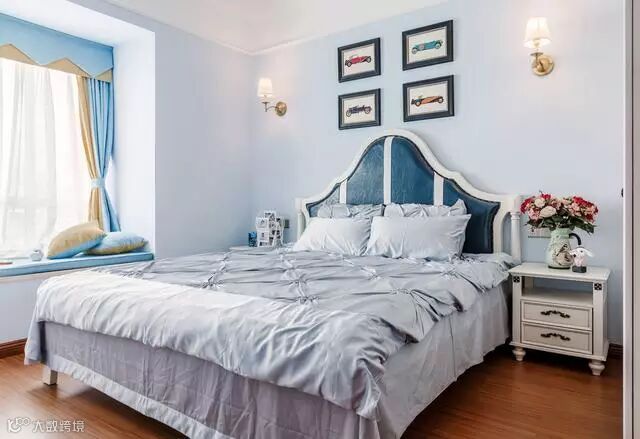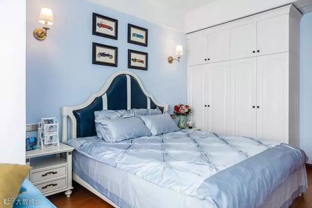 主卧整体颜色选的是女主人最爱的淡蓝色,衣柜和床是白色的,与整个房间的色调很搭配,一点也没有违和感。