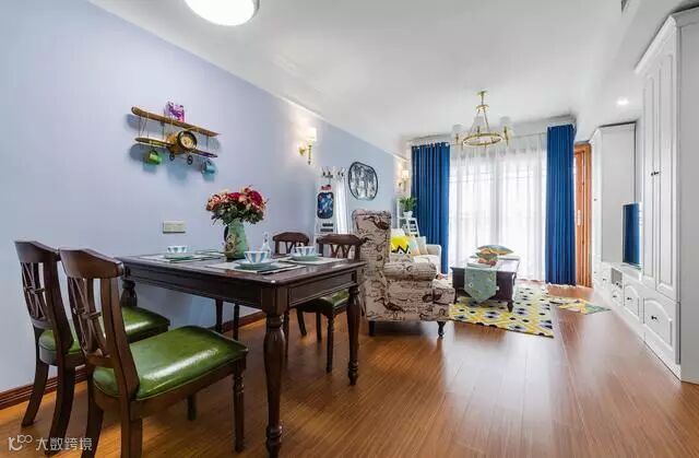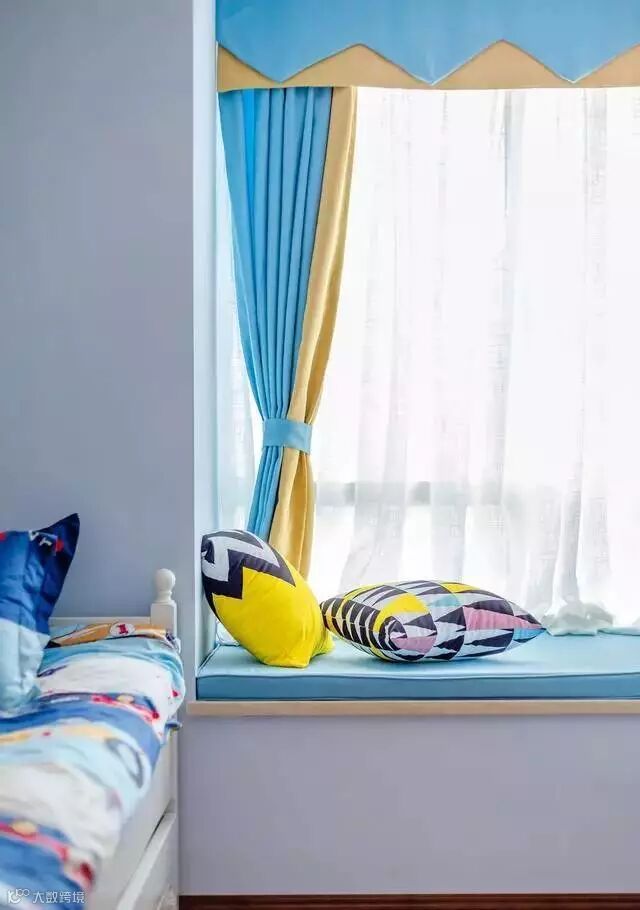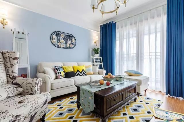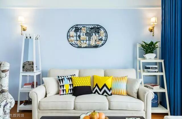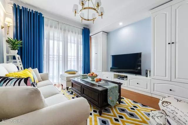 整间房子都是粉刷着淡蓝色的颜料,在搭配白色的电视收纳柜超级匹配的。还有窗帘是白色加深蓝色的,又是一个呼应点。