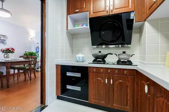 厨房的整体色调以白色为主,再用原木色的橱柜起到了点缀的作用,整个看起来特别的协调。