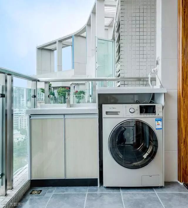 阳台是开放式的,因为打扫卫生特别麻烦,所以在后期屋主准备把阳台给包起来。在阳台的一边做了一个小的柜子,并且把洗衣机也放在了阳台。