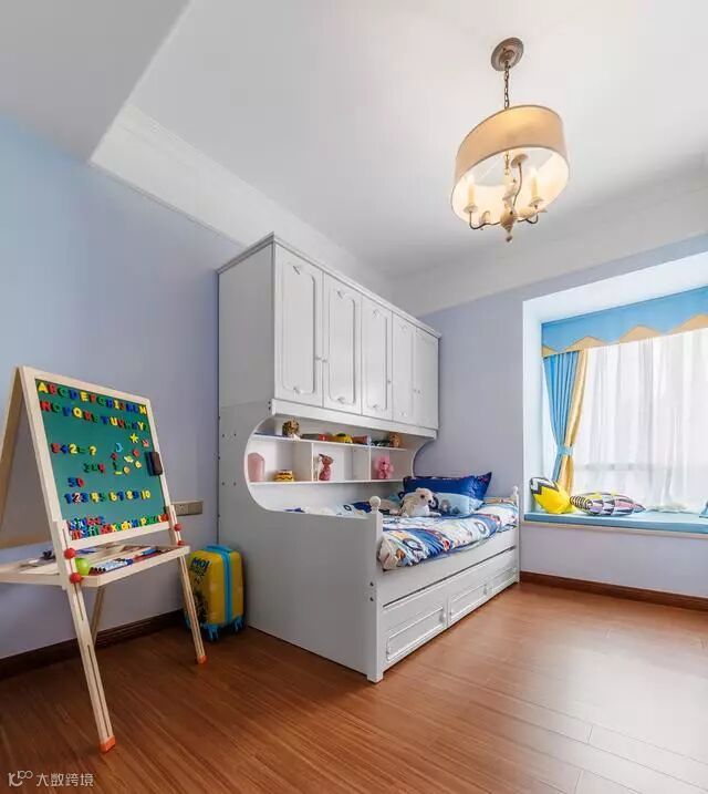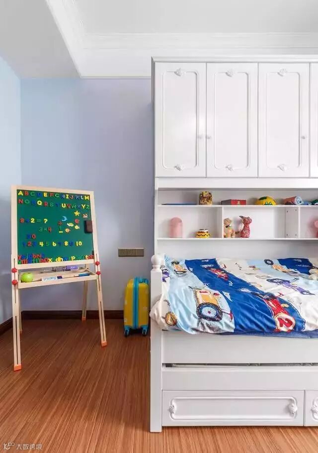 儿童房整个以干净整洁为主,因为孩子还小,屋主没有做书桌书柜,等以后孩子上学了再买。给孩子的小床也是以增加储物空间为主,在床上自带了置物架和衣柜,不仅节省空间还特别漂亮。