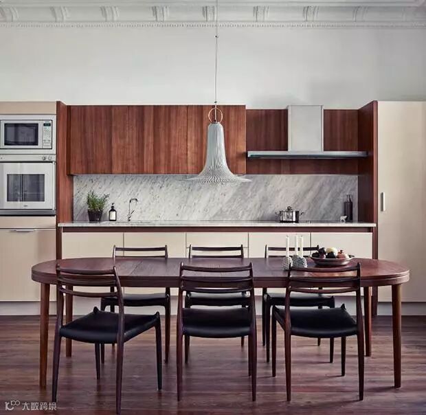 餐厅与厨房形成了巧秒的互动,椭圆形的餐桌显得很自然,又带着温度。素色和木纹搭配的橱柜,呈现出一个温馨又清新的厨房。